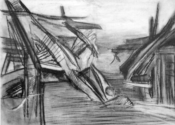 Charcoal on paper. Impression of the destroyed Allenby Bridge after the 6 day war.